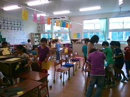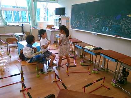 その中を、スプーンにピンポン玉を乗せて落とさないように運びます。