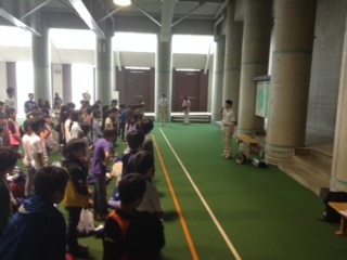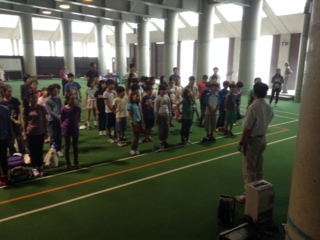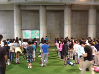 閉室式。世田谷小学校と合同で行いました。多聞小学校の担当で式が進められました。三日間の楽しかった活動を確かめ合い、なかのビレジのスタッフの方への感謝の気持ちを伝えました。
