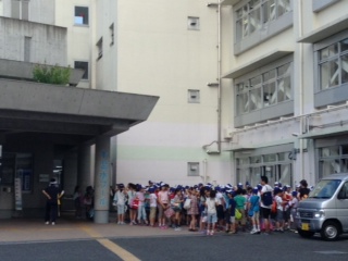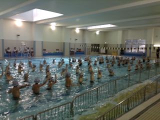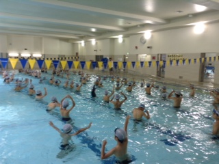 バス3台に分乗して、梅丘中学の温水プールへ行きました。今日は検定を行いました。