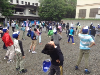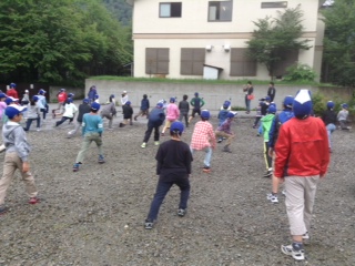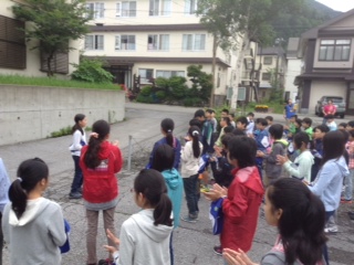 朝会。新鮮な空気を胸いっぱい吸って、体操をしました。さあ今日も一日、はりきっていきましょう。