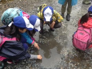 湯元源泉へ。10円玉を温泉につけてみて…。