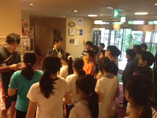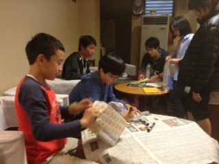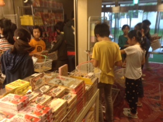 おみやげ買い物タイム2。担任の先生からお小遣いを受けとり、買ったあとはレシートとお釣りを預けます。部屋の友達のものとわからなくならないように、袋に名前を書きます。