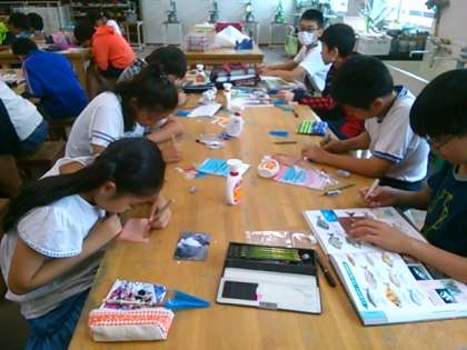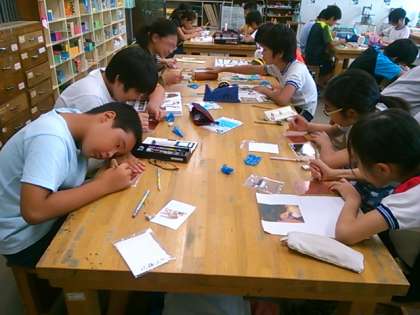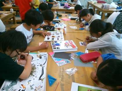 自分で用意した、動物や魚などの写真や図鑑を見ながら、