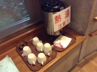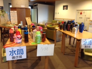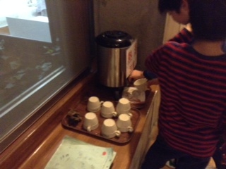 お茶は毎日、補助員さんが全員の水筒に入れます。廊下にもお茶を用意してくれていて、子どもたちはいつでも自由に飲むことができます。