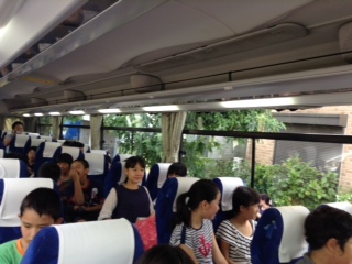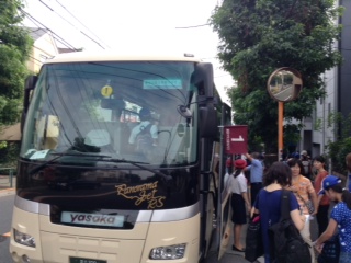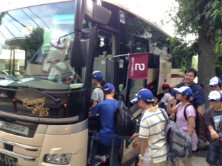バスに乗って、いよいよ出発です。出発式の「行ってきます」コールはまさかのダメ出し3連発でしたが、バスの車内で子どもたちのテンションも上がってきました。出発間際まで、大勢のお見送り、ありがとうございました。