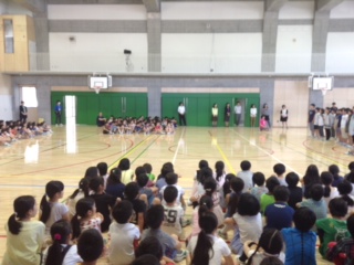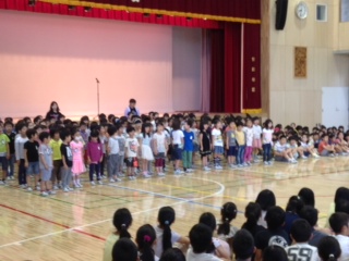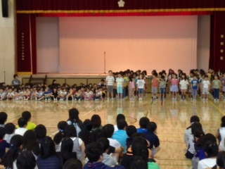 美しい日本語週間の最終日の今日、全校児童が集まって、音読発表会をしました。1年生から順番に学年ごとに、日頃の教科「日本語」の学習の成果を発表しました。