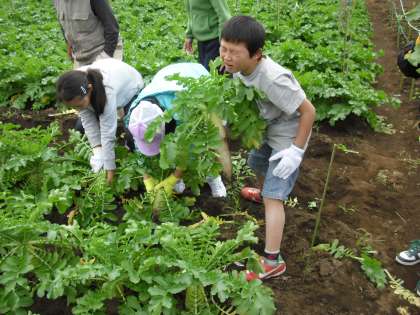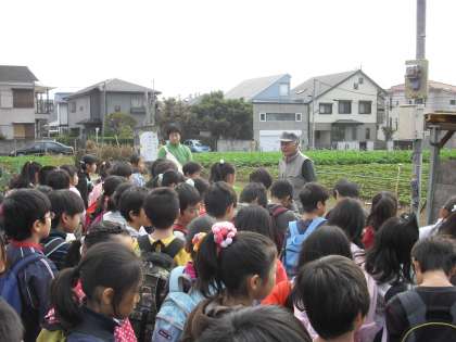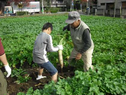 総合的な学習の時間の食育の単元「健康ってなあに」の学習の一環として、実際に区内の畑に出かけて大根を抜いてきました。
