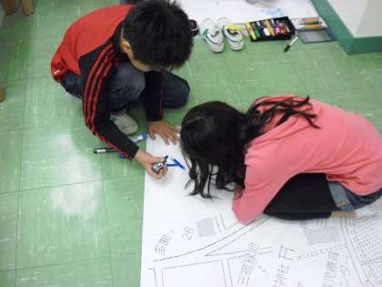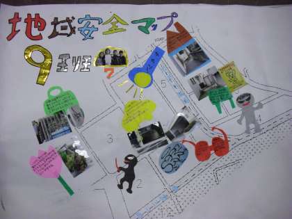 総合的な学習の時間に『地域安全マップ』を作成しました。犯罪の起こりやすい、“入りやすく見えにくい場所”について考えました。31名もの保護者の方にご協力いただき、実際にフィールドワークを行い、自分たちの住んでいる地域を見つめ直しました。調べたことを模造紙にまとめ、『地域安全マップ』が完成しました。