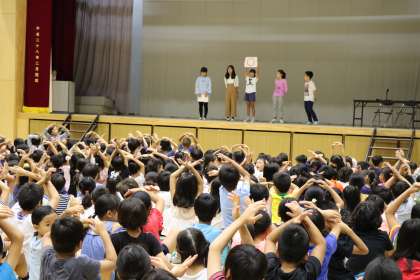 今朝の「丘の子さわやかタイム」は広報委員会の委員会紹介集会でした。「広報委員会、それは宇宙も驚かせる、最強の委員会」というナレーション付きの映像で始まります。広報委員会は、月に一度の新聞やポスターを作ったり、毎日の給食のメニューや食材の栄養素を記入したりします。映像やクイズで仕事の様子を紹介しました。台本も映像の内容も、全て子どもたちが考え、作りあげました。委員会活動とは、多聞小学校の全員が、より気持ちよく生活できるために仕事をします。どのような活動をしているのか、なかなか目立たないので今日のような集会で5・6年生ががんばっている様子がよくわかります。