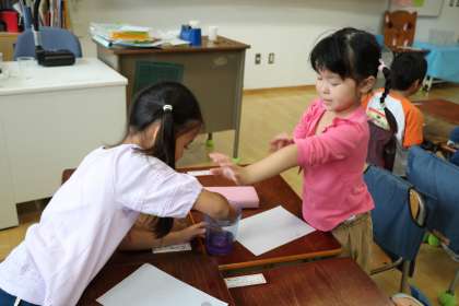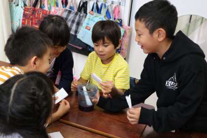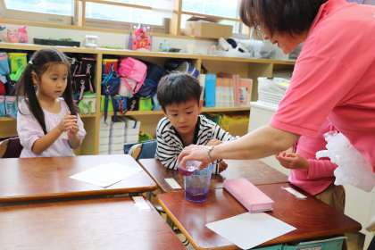 生活科の学習「朝顔で遊ぼう」の様子です。花で色水を作りました。とんとんたたいたり、手でつぶしたりすると、みるみるきれいな色水ができあがります。半紙をたたんで染めて、模様作りにも挑戦しました。