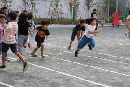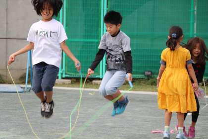 写真は、2人縄とびを上手に何回も跳ぶ6年生、下級生のボールキャッチを見守る6年生、バトンをつなぐために全力で走る様子です。