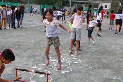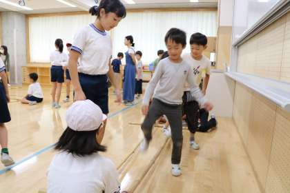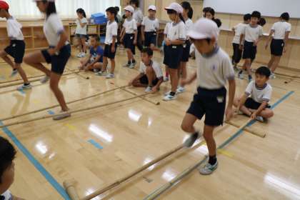 今朝は、ウェンズデータイムでした。多聞小学校では、友だちと関わり合い、楽しく運動する態度をはぐくむことを目的として、毎週水曜日の15分間、様々な体育的活動に取り組んでいます。縦割り班ごとに14か所の活動場所を、順番にローテーションします。異学年の友だちとも運動し、互いにアドバイスをしたり、見合ったりすることで、新たにできるようになり笑顔になる様子がたくさん見られます。写真は、バンブーダンス、ケンパの様子です。