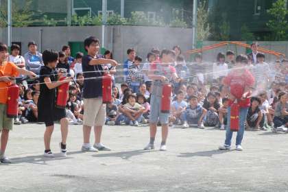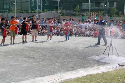 6年生の代表が、消火器を使い、初期消火訓練を体験しました。消火器の扱い方をしっかり聞いていたので、手際よく、消火活動に当たることができました。見ている全校児童も真剣です。
