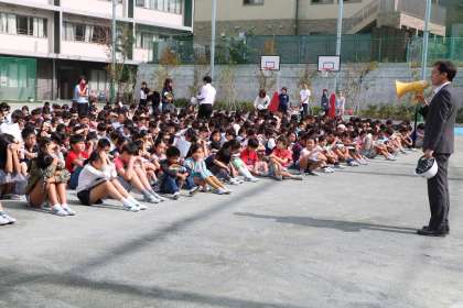 今日は10月の避難訓練がありました。主事室からの出火という想定でした。おしゃべりをしない、ハンカチを口に当てる、みんな真剣に取り組みました。