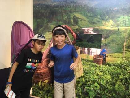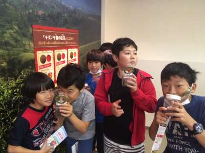 ひみつの資料館で茶摘みカゴを背負う体験やペットボトルの膨らむところや茶葉の香りもかぎましました。