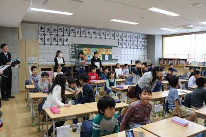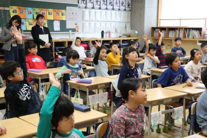 元気よく教科「日本語」の授業で、漢詩を朗唱する3年生の様子です。