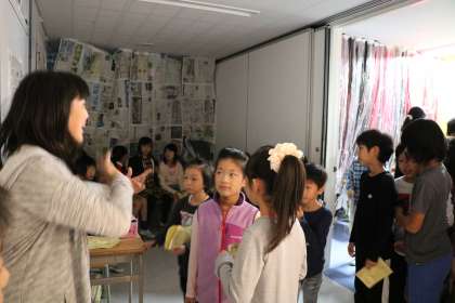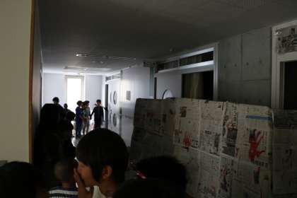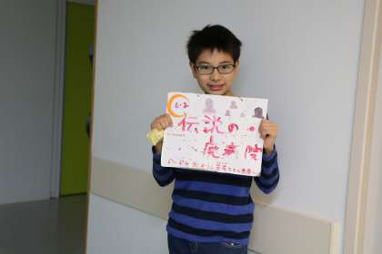 6年生は小学校最後の丘の子フェスティバルです。6年生のお店は1組「恐怖のカルテと廃病院」2組「伝説の廃病院〜よみがえりし患者たちの悪夢〜」というお化け屋敷です。中は残念ながら暗くて撮影ができません。1組はウェイティングポイントで話を聞くところから、目隠しをしなければならず、どきどきで始まります。2組はワークスペース2教室分という長い道のりを、進んでいきます。呼び込みの効果もあって長蛇の待ち列です。順番待ちで並んでいる下学年の子たちも、入る前からどきどきを楽しんでいる様子でした。