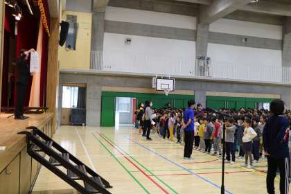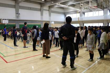 静かに整列して、朝会が始まります。特に、5・6年生は、自分たちから、静かにしようという声が飛んだり、気がついたりできるので、どの学年より行動が早いです。