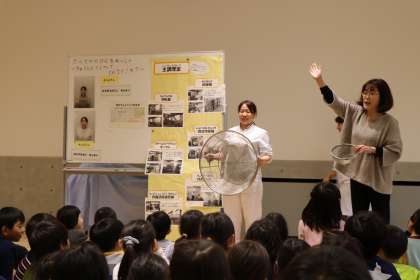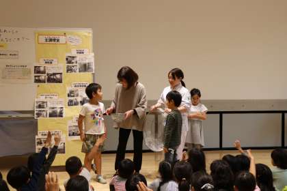 生活科「たべものげんきれっしゃ」の学習の1時間目です。栄養士の先生と、給食調理スタッフのチーフに来てもらい、給食室の様子を聞きました。調理室の機材や道具は、家庭の道具と比べて大型であることにびっくりしていました。毎日食べているおいしい給食が、どんなところで、どんな道具で作られているのか知りました。