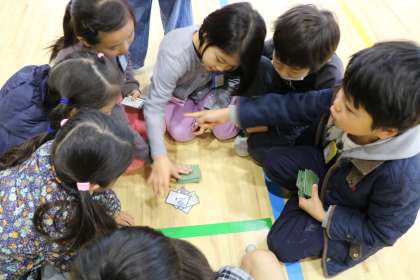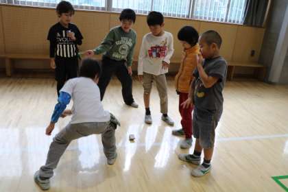 けんだま、めんこ、ぼうずめくりで遊んでいる様子です。遊びを教えていただいた、環境学習支援グループのみなさん、ありがとうございました。