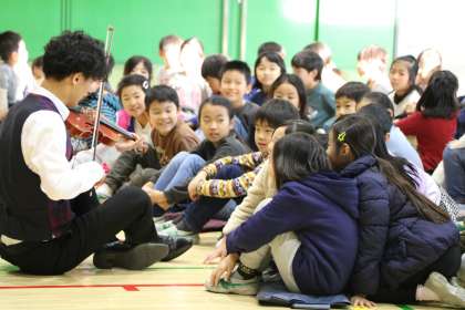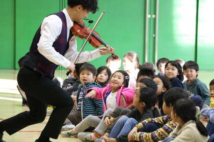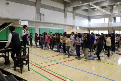 最後はアンコールに応えて、多聞小学校校歌を演奏してくださり、みんなで声を合わせて歌いました。ヴァイオリンとピアノをたっぷり楽しませていただきました。