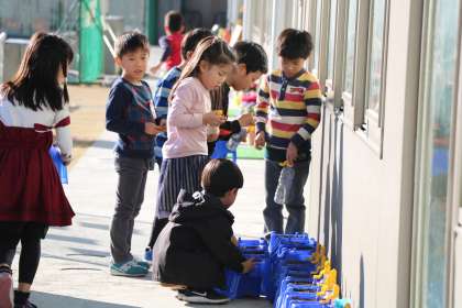 ふわふわベットに入っているの。水もたっぷりあげようね。といいながら、校庭の犬走りに並べました。花が咲く頃は、2年生ですね。