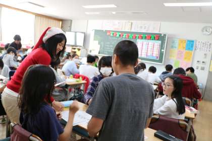 6年生英語の授業の様子です。ゲームを楽しむために、クリスマスにちなんだ単語を発音したり書いたり真剣です。