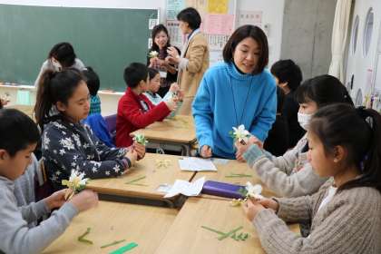 1/17 5年生コサージュ作り−1 公開日 2019/01/18 更新日 2019/01/18 校長室より 3月の卒業式で、卒業生が胸花をつけます。多聞小学校はその胸花を、5年生の子どもたちと保護者の方が手作りします。一番近くで見てきた6年生とのいろいろな思い出を振り返ったり、自分が最上級生になることを考えたり、それぞれ思いのこもったコサージュを作ります。 いいね(0) 学校行事 1年 2年 3年 4年 5年 6年 委員会・クラブ活動 地域連携