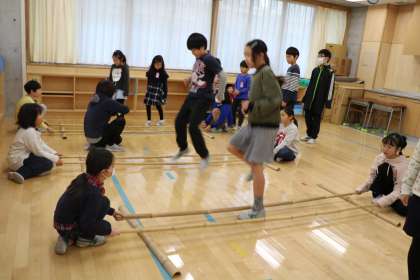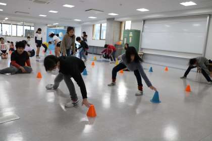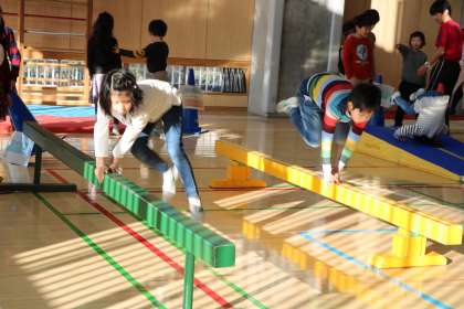今学期初めてのウェンズデースポーツがありました。写真はバンブーダンス、体育館マット、コーンタッチの様子です。最初はぎこちなくても、先生や6年生に少しアドバイスをもらうと、とても動きが良くなります。