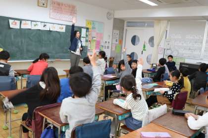 ALTのアイリーン先生と、外国語活動の学習です。野菜の名前がたくさん出てきます。「丸くて、色は緑で、かたくて・・・」とヒントを聞きながら何の野菜か当てるクイズには、みんな夢中です。日本語で書きましたが、もちろんクイズのヒントは英語です。