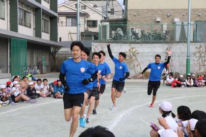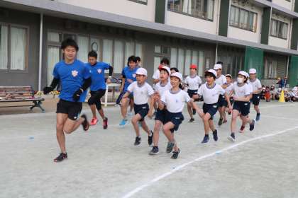 最後に駅伝選手による「箱根駅伝のペース」である、1000m3分を切るペースでのランニングを見せていただきました。各クラスの代表といっしょにスタートします。3周走ったところで、小学生は抜けて応援です。全速力で走った各クラスの代表は、息を切らしながら「すごい!僕、全力出したのに、選手たちまだスピードが上がっている」「3周以上あのペースで走るの無理だよ。」と言っていました。応援する子ども達は初め、圧倒されていましたが、その後大声援で、選手を見ていました。