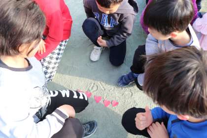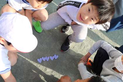 今日の丘の子さわやかタイムは「ありがとう集会」でした。ハートの紙を一人一枚もって始めます。紙にはあ・り・が・と・うの字が一文字書いてあります。同じ色の人を5人探し、『ありがとう』を完成させます。「ピンクの人いませんか」「紫の『あ』の人いませんか」と声をかける子。困った顔でたたずむ子。困っている子に声をかけてあげる上級生。子どもたちのすてきな様子をたくさん見ることができました。5人グループができると、ハートを並べている姿もかわいらしかったです。