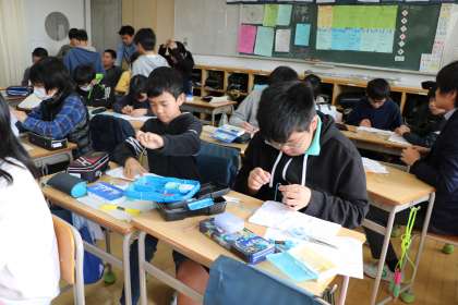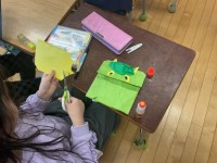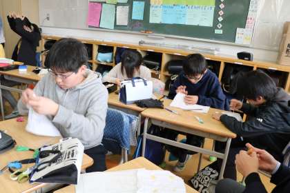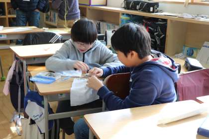 6年生の教室をのぞくと、卒業制作であるぞうきんを縫っていました。ただ縫うのではなく、思い思いの絵を刺繍しています。
