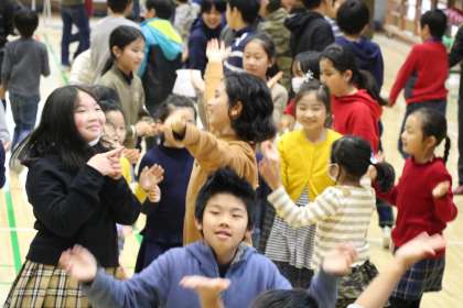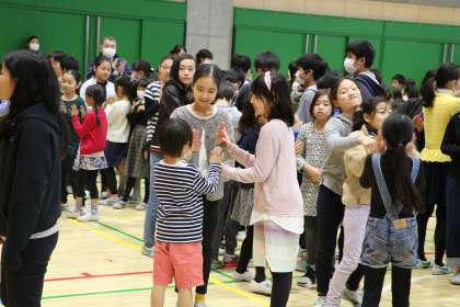 全校合唱は「どんまい」です。学年関係なく、歌い、ハイタッチ・手拍子し、踊る、楽しい曲です。