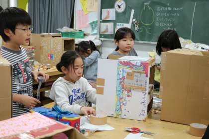 途中、担任の先生も見に来てくれたので、それぞれ、自分の作品のみどころを紹介している子どもたちでした。