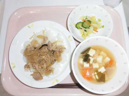 平成31年4月22日(月) 公開日 2019/04/24 更新日 2019/04/24 給食 <献立> 豚丼 牛乳 味噌汁 即席漬け <主な食材産地> たまねぎ 北海道 ねぎ 千葉 にんじん 徳島 じゃがいも 鹿児島 大根 千葉 キャベツ 神奈川 きゅうり 埼玉 しょうが 高知 豚肉 青森 米 山形 いいね(0)