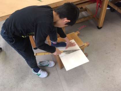 内容を理解した後、材料を上手にのこぎりで半分にし、危なくないように角の面取りを紙やすりで丁寧に作業する5年生です。