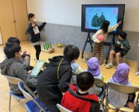 この後、代表児童がワークショップで舞台の上に上がるので足袋を履いて準備してます。