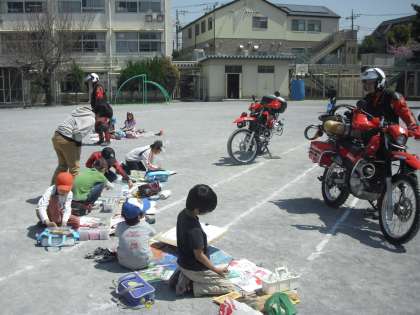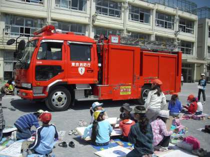 世田谷消防署三宿出張所から、消防車、赤バイク、救急車に出向いていただきました。