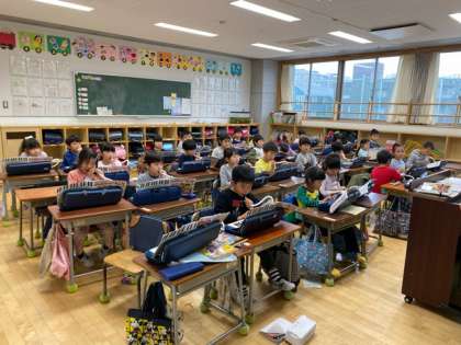 1年生(ひとりずつでの練習)と6年生(少人数でのグループ学習)の音楽授業の様子です。