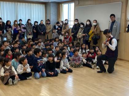 プロのピアノとバイオリンの演奏を聴けた学年もあります。大喜びの丘の子です。