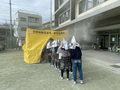 今日の避難訓練は、理科室からの火災発生を想定し行いました。いつ、どこで災害が起こるか分かりません。よって、日頃から臨機応変に行動できるよう、学校には様々に学びの機会があります。「避難の様子、話を聞く態度、大変立派でした。」と、煙霧体験の場を設定してくださったまちづくりセンターの方々にも褒めていただきました。