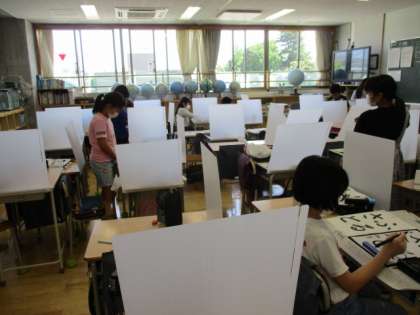 5年生の書道の授業では、筆の持ち方や線の始めの筆の置き方などを先生が黒板で示し、一人一人が練習、清書と丁寧に行っていました。(机上の白い仕切りは、コロナ対策のパーテーションです。)