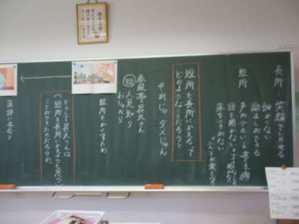 6年生の道徳では、教科書に載っている春風亭昇太さん(落語家)のお話をもとに授業が進められました。春風亭昇太さんは、「人見知りでおしゃべり」という自分の短所を隠すことばかり考えていたのですが、落語大会で優勝したことをきっかけに短所を長所にすることもできると思い頑張ってきたということでした。6年生の子どもたちは、真剣なまなざしで自分のことをワークシートに記入していました。
