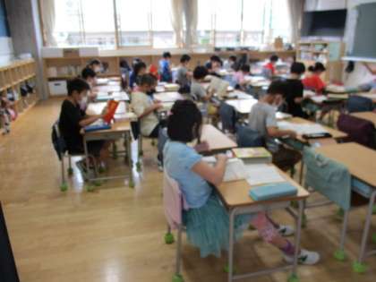 3年生の国語の授業では、国語辞書を使う学習をしていました。プリントの言葉を辞書で調べ、全て終わった児童が挙手すると、先生がかかった時間を告げていました。波を打ったようにしーんと静まり返って、全員集中していました。音楽の授業では和太鼓登場!おじぎの仕方から、バチの持ち方、太鼓の打ち方まで習っていました。みんなポーズが決まっていました‼
