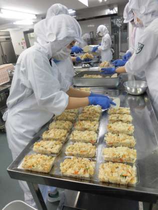 配膳をしやすいようにパックづめをして教室に配ります。