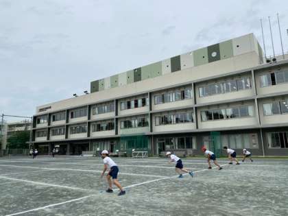 6年生の体育授業では、「もう一度チャレンジ!」と30mを全速力で走ろうとしています。次の授業でのハードル走につなげるため、より速く、よりリズムよく、走る練習をしていました。