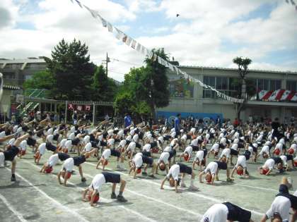 準備運動は音楽に合わせて、しっかりと行います。恒例の、全校生徒による側方倒立回転やブリッジも見事に決まり、待ちに待った運動会の幕開けです。