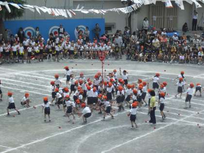 「玉入れ」は、「UFO」の曲に乗って楽しく踊りながら、音楽の合間に思い切り投げました。結果はなんと、引き分けでした。