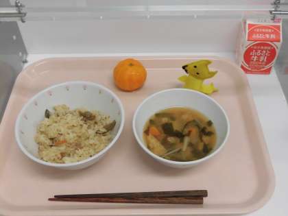 豚肉とごぼうのご飯・みそ汁・冷凍みかん・牛乳